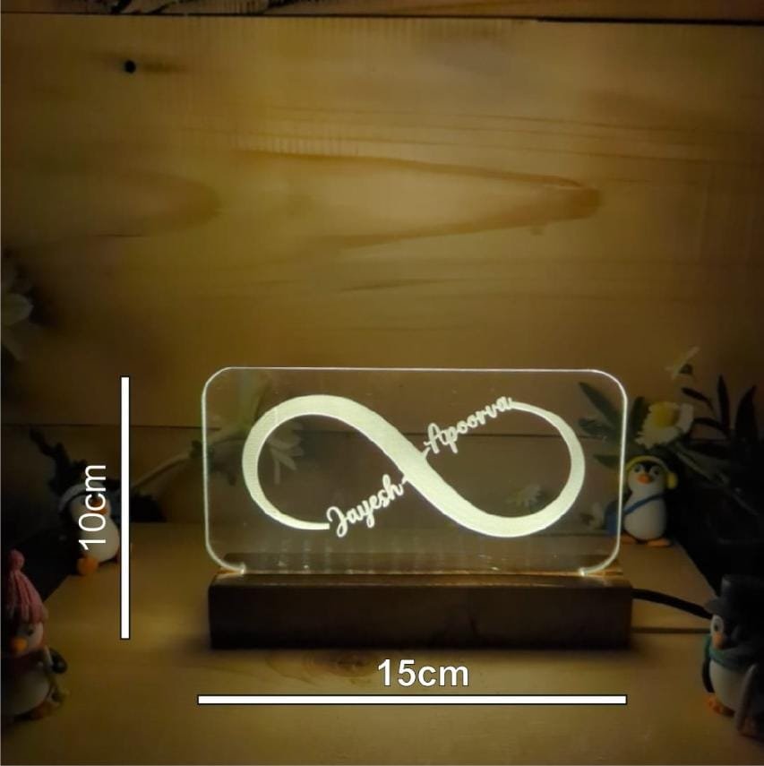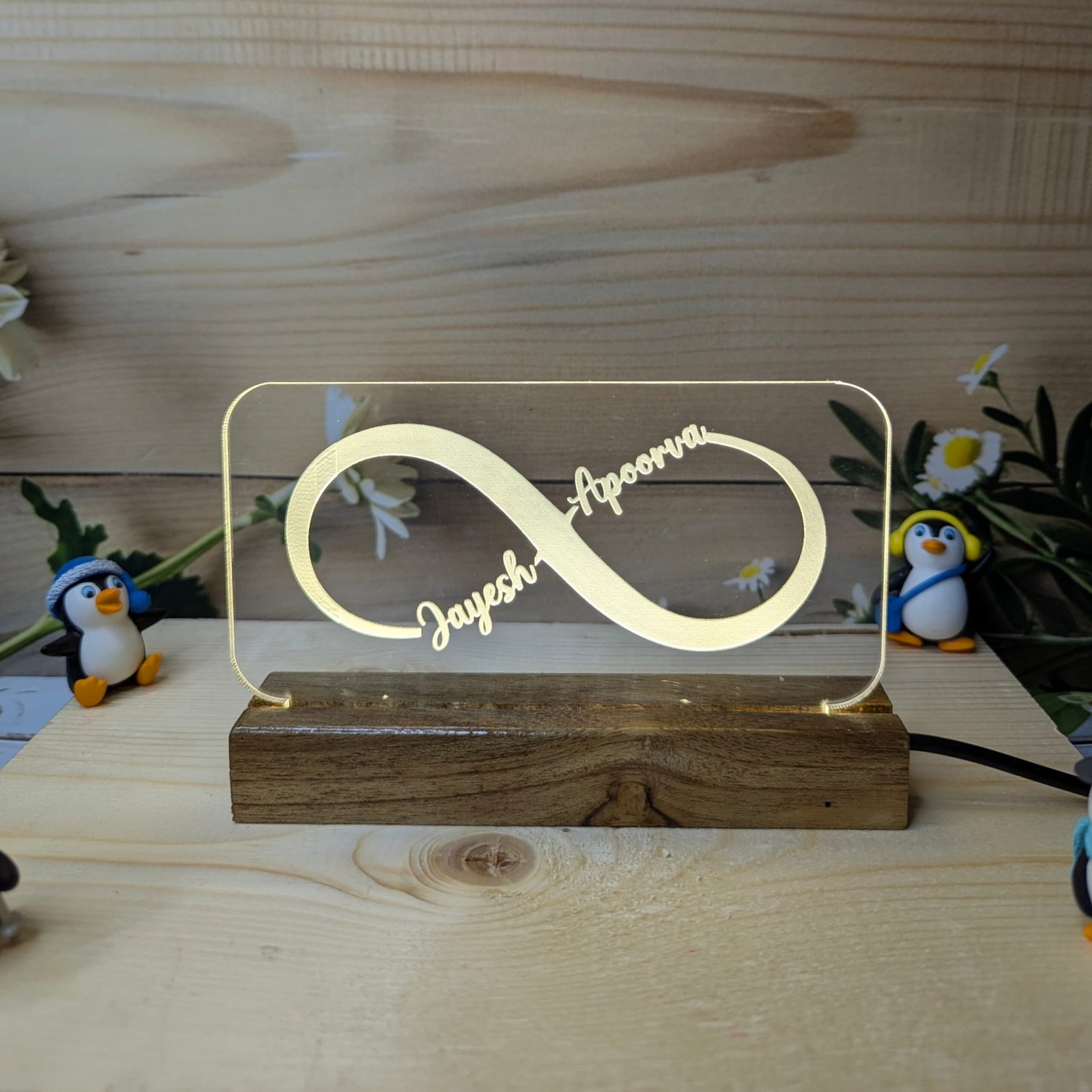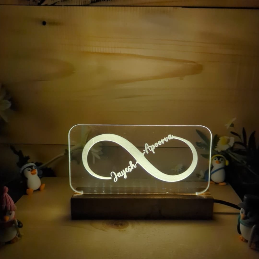 The lamp is crafted from premium-quality acrylic, ensuring durability and a sleek, crystal-like finish that beautifully scatters light. It features a solid wooden base, adding a warm and natural touch to the design. What truly sets this lamp apart is the customization option – engraved with custom couple names in an infinity symbol design. This personalized detail makes it a sentimental piece, designed to reflect your intimate connection and shared journey.